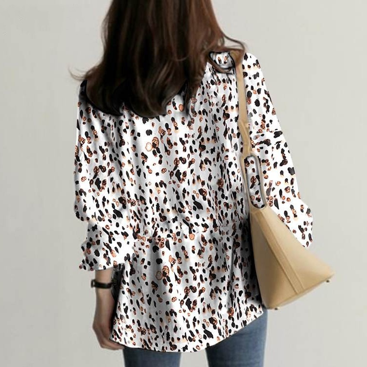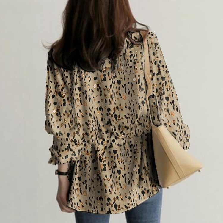 ヨーロッパとアメリカのゆったりとした豹柄プリントシャツ長袖トップス秋の女性用Vネックカジュアルフルスリーブシャツ